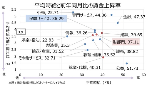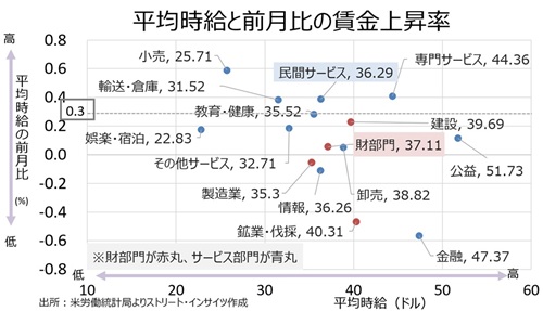 業種別を前月比でみると、平均時給の伸びが0.3%以上だったのは13業種中で4業種で、前月の速報値ベースの8業種を上回った。小売が同0.6%上昇と伸びが目立ったほか、輸送・倉庫が同0.4%上昇、就業者が減少した専門サービスが同0.4%上昇と堅調で、教育・健康も同0.3%上昇した。一方で、金融や鉱業・伐採、情報、製造業の4業種は下落した。前月の3業種(製造業、教育・健康、公益)から増加し、製造業は前月に続きマイナスとなった。なお、平均時給の計算式は「総給与額 ÷ 総労働時間」であり、総給与額には①給与、②残業代、③ボーナスーーが含まれる。