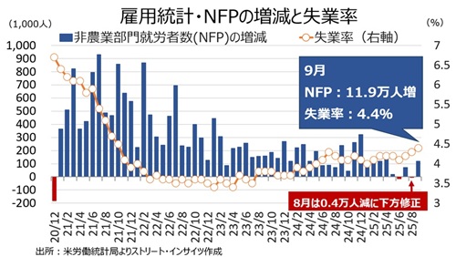 米9月雇用統計・非農業部門就労者数(NFP)は前月比11.9万人増となり、市場予想の5.3万人増を上回った。5カ月ぶりの強い伸びとなる。前月は2.2万人増→0.4万人減に下方修正された。
