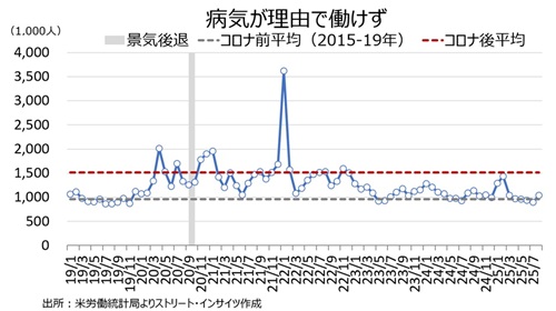 「病気が理由で働けない」とする人々は、前月比9.8万人減の93.9万人へ減少。前月はコロナ前平均の2015‐19年の平均値の93万人に接近にしました。