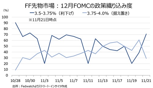 ウォール・ストリート・ジャーナル(WSJ)紙のニック・ティミラオス記者が指摘したように、FOMC参加者が労働市場より、インフレ警戒を示すのも致し方なし、の結果に見えます。ところが、NY連銀総裁が11月21日、短期的に利下げ余地ありとの見解を寄せ、12月FOMCをめぐっては据え置きから再び利下げの観測が強まるなど、乱高下しています。。