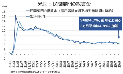 民間部門の総賃金(雇用者数×週平均労働時間×時給)は、前月比0.3%増と前月の0.1%増を上回った。前年同月比は過去分の修正もあって4.7%増、前月の4.5%超えに。3カ月平均も4.8%増と、前月を上回った。