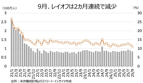 レイオフ(一時解雇)は前月比5.3万人減の83.3万人、2カ月連続で減少した。失業者に占めるレイオフの割合は前月の12.1%→11.1%と、約1年ぶりの水準に低下した。