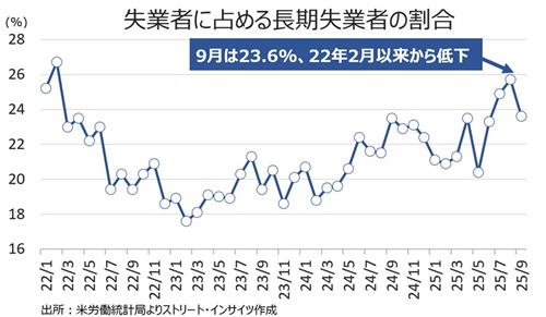 失業者とは、①失職中、②過去4週間に職探しを行なった、③現在、勤務が可能――の3条件を満たす必要がある。失業期間の中央値は前週の9.8週から10週へ延びた。一方で、27週以上にわたる失業者の割合は2022年2月以来の水準へ上昇した前月の25.7%→23.6%へ低下。