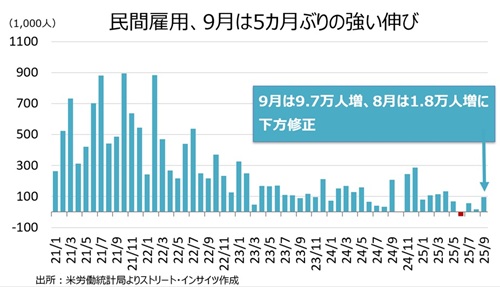 チャート:民間就労者数、9月はNFPと同じく5カ月ぶりの強い伸び