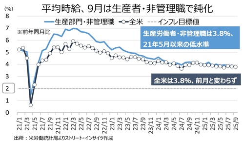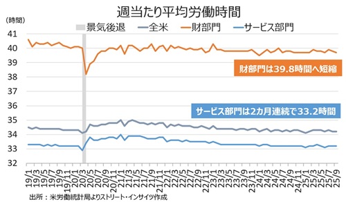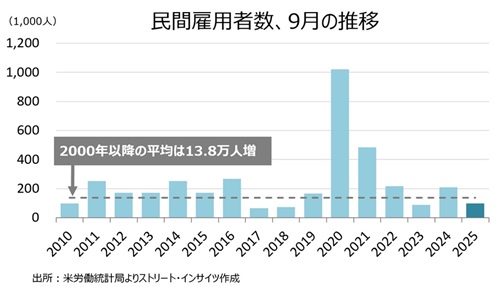 NFPの内訳をみると、民間就労者数は前月比9.7万人増と市場予想の6.2万人増を上回った。前月の1.8万人増(3.8万人増から下方修正)より強い。年末商戦の臨時雇用が支えとなった可能性が考えられるが、9月単月では2024年の20.8万人増を下回り、2000年からの平均値13.8万人増にも届かず、底堅いものの好調とは言い難い。民間サービス業も同8.7万人増と、前月の5.0万人増(6.3万人増から下方修正)を上回った。