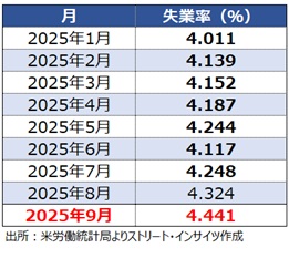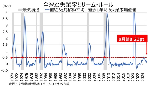 失業率は上昇するなか、サーム・ルールが示す分岐点0.5ポイントに小幅ながら近づいた。サーム・ルールとは、直近3ヵ月間の失業率の移動平均と過去12カ月間の最低値の差が0.5pt以上なら、景気後退入りするとの説だが、9月の失業率が4.4%へ上向いた結果、移動平均と最低値の差は0.23ptと前月の0.13ptから上昇した。