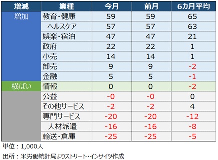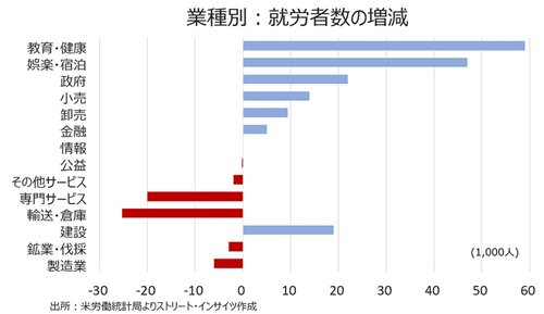 サービス部門のセクター別動向は11業種中で6業種で増加し、前月の速報値ベースの5業種を上回った。今回最も雇用が増加した業種は引き続き教育・健康で前月比5.9万人増。その他、娯楽・宿泊や政府が下支え。年末商戦を控え、小売は3カ月連続で増加した。一方で、5カ月連続で専門サービスが減少したほか、その他サービス、公益に加え、年末商戦を控えながら、輸送・倉庫が減少に転じた。