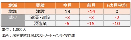 財生産業は前月比1.0万人増と、5カ月ぶりに増加した。業種別をみると、建設が同1.9万人増と4カ月ぶりに増加した。一方で、鉱業・伐採は0.3万人減と5カ月連続で減少。製造業は関税の影響も重なり、同0.6万人減と5カ月連続で落ち込んだ。