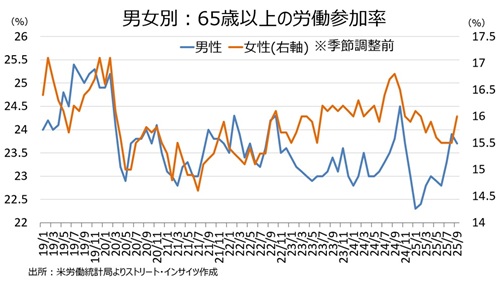65歳以上の高齢者の労働参加率は、男性で低下し女性が急伸した。ただし、これらは季節調整前の数字となる。