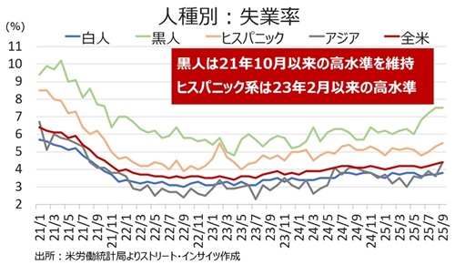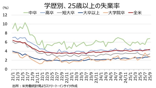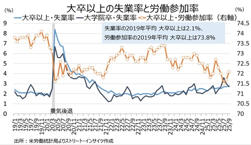 人種別の失業率は労働参加率の改善につれて、黒人を除き上昇した。特に、アジア系は21年8月以来の水準へ急伸したが、大卒の失業率上昇の動きと一部整合的だ(後述)。