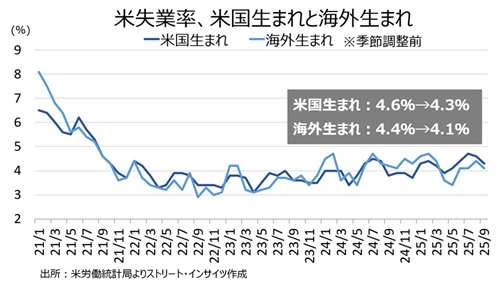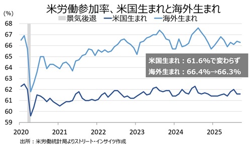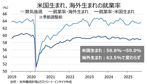 2024年の米大統領選でトランプ氏が勝利した理由は、不法入国者を含めた移民の急増だった。米議会予算局やサンフランシスコ連銀など、多くが移民の急増をめぐる影響を分析するように、コロナ禍後の足元の米労働市場にも大きな変化をもたらした。しかし、足元はトランプ政権の不法移民取り締まり強化に伴い、コロナ禍後の移民流入の増加分が巻き戻されつつある。そこで、海外生まれ(不法移民を含む)と米国生まれの雇用動向を確認してみた。