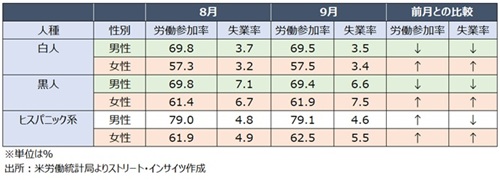 人種別の労働参加率は、そろって上昇。黒人は約1年ぶりの高水準、ヒスパニックは5カ月ぶりの水準を回復、アジア系は3カ月ぶりの水準を回復した。なお、データはアジア系を除き全て季節調整済みとなる。