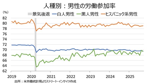 人種・男性別の労働参加率は、白人と黒人は低下し、ヒスパニック系のみ上昇した。