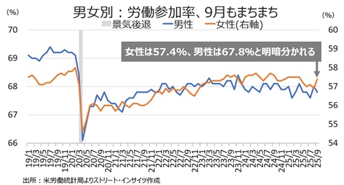 ーー米9月雇用統計では、働き盛りから65歳以上まで女性の労働参加率の改善が際立った一方で、失業率が上昇しています。その反面、男性は働き盛り世代の他、白人と黒人の間で労働参加率が低下し、労働需給のミスマッチが伺えます。WSJ紙のニックは、12月FOMCの利下げをめぐり、意見が対立していると報じていましたが、米8月雇用統計の結果でお伝えした通り、バイデン前政権で導入したDEIの精神はどこへやら。政権交代により看板を外すなら、FRBの体制が政治の影響と無縁ではない事実が浮かび上がります。