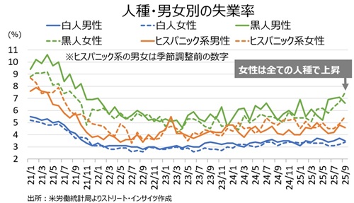 人種・男女別の失業率、労働参加率で低下が優勢だった男性で低下し、逆に労働参加率が改善した女性は上昇。特に黒人とヒスパニック系の女性の失業率は、2021年以来の水準へ急伸した。