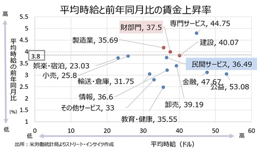 平均時給は前月比0.2%上昇の36.67ドル(約5,760円)で、市場予想の0.3%と前月の0.4%(0.3%から上方修正)下回った。2021年2月以降の上昇トレンドは維持。前年同月比3.8%と市場予想の3.7%を超え、前月と一致(3.7%から上方修正)した。生産部門・非管理職は前年同月比3.8%、前月の3.9%を下回り21年5月以来の低い伸びとなり、管理職を含む全米と違って賃金の伸びが抑制されたことが分かった。