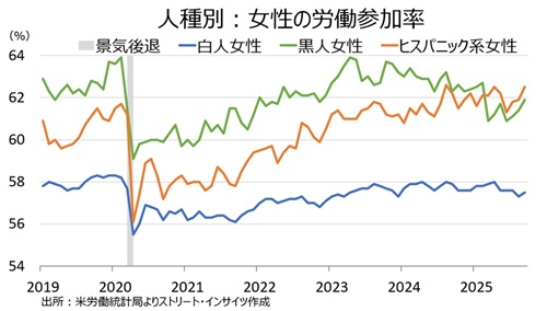 人種・女性別の労働参加率は、そろって上昇した。なお、ヒスパニック系女性の労働参加率は3月から黒人女性を逆転し続けている。