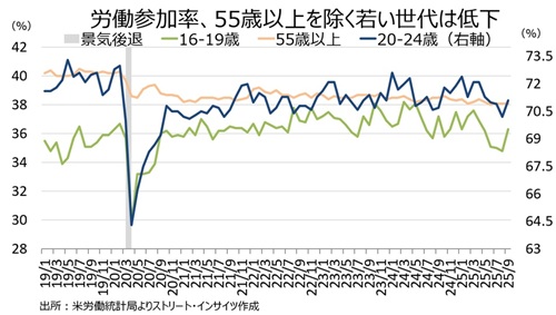 チャート:16~19歳、20~24歳、55歳以上の労働参加率