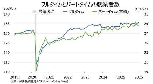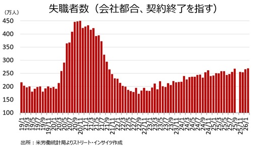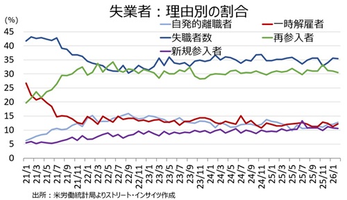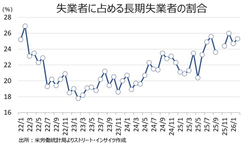 失業者とは、①失職中、②過去4週間に職探しを行なった、③現在、勤務が可能――の3条件を満たす必要がある。失業期間の中央値は2021年12月の水準に並んだ前週の11.0週から11.1週へ延びた27週以上にわたる失業者の割合も前月の24.7%→25.3%。2025年12月は26.0%と、2022年2月以来の水準へ上昇していた。