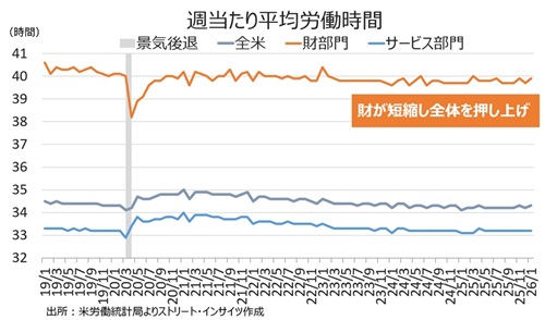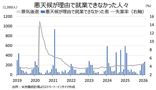 「悪天候が理由で働けない」とする人々は、前月比3.0万人増の26.7万人へ増加。積雪などの影響が及んだ可能性があるものの、影響は部分的だったとみられる。