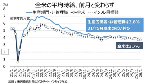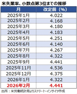 失業率は4.4%と、市場予想と前月の4.3%を上回った四捨五入前では4.441%。しかし、労働参加率が62.0%と前月の62.1%(62.5%から下方修正)を下回っており、職探しをする人々が減少したにもかかわらず、失業率は上昇した。失業者数が同20.3万人増、就業者数が同18.5万人減だった結果、失業率の上昇につながった。なお、今回は政府機関の閉鎖で2026年の人口推計の更新が実施された。