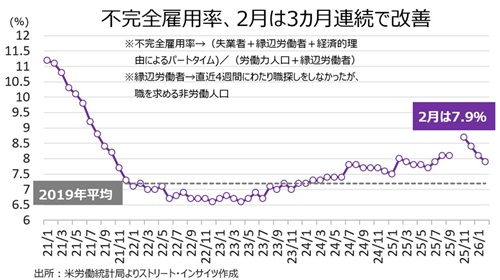 経済的要因でパートタイム労働を余儀なくされている者などを含む不完全雇用率は7.9%、2025年11月の8.7%から3カ月連続で低下した後述するように、これはパートタイムの雇用が減少したためと考えられる。