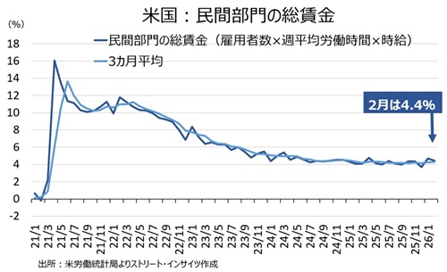 民間部門の総賃金(雇用者数×週平均労働時間×時給)は、前月比0.3%と2カ月連続でプラス。前年同月比は4.4%増、前月の4.7%増を下回った。3カ月平均は4.3%増と、前月と概ね変わらなかった。