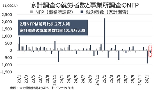 今回、事業所調査(給与台帳ベース、NFPや平均時給、週当たり労働時間など、CES)と家計調査(聞き取り調査ベース、失業率や労働参加率など、CPS)の就業者数の数字を比較すると、家計調査の就業者数は前月比18.5万人減と、NFPの9.2万人減と同じくマイナスだった。