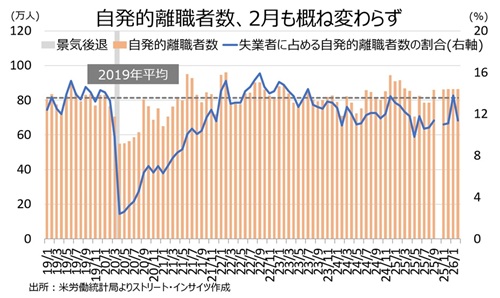 自発的離職者数は前月比0.1万人増の86.5万人だった。3カ月連続で概ね変わらず。自発的離職者数に占める失業者の割合は、前月の12.1%→12.8%へ上昇した。