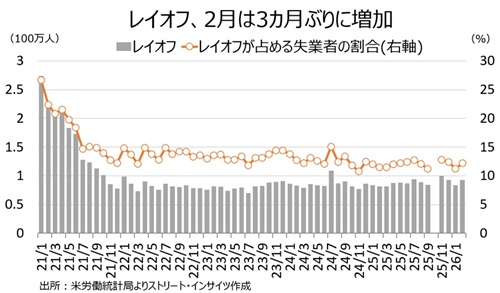 レイオフ(一時解雇)は前月比8.6万人増の92.5万人。2024年7月以来の100万人乗せとなった25年11月の水準以下が続く。失業者に占めるレイオフの割合は前月の11.2%→12.2%に上昇した。