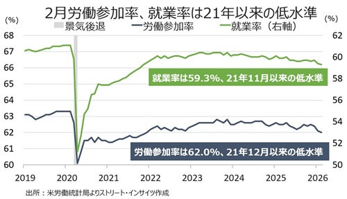 チャート:労働参加率、就業率はそろって2021年以来の低水準
