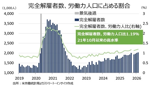 チャート:労働人口に占める完全解雇者の割合、2021年10月以来の高水準