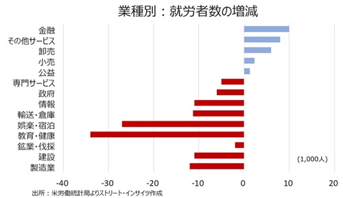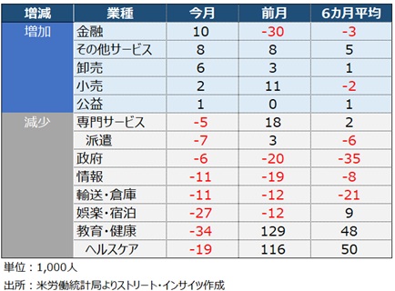 サービス部門のセクター別動向は11業種中で5業種で増加、速報値ベースでの前月の6業種を下回った。今回最も雇用が増加した業種は金融で、続いてその他サービス、卸売、小売、公益が並んだ。一方で、これまで雇用をけん引してきた教育・健康は3.4万人減。これは、医療保険大手カイザー・パーマネンテのストライキで3万人超が就業できなかったため。その他、娯楽・宿泊や輸送・倉庫、専門サービスなどがマイナスだった。