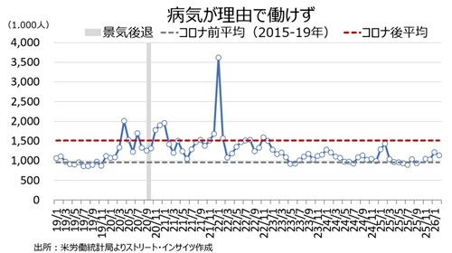 「病気が理由で働けない」とする人々は、前月比7.8万人減の113.5万人。ただし、4カ月連続でコロナ前平均の2015‐19年の平均値の93万人を上回った。